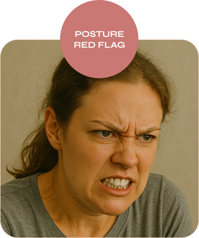 Jaw clenching and hunched shoulders